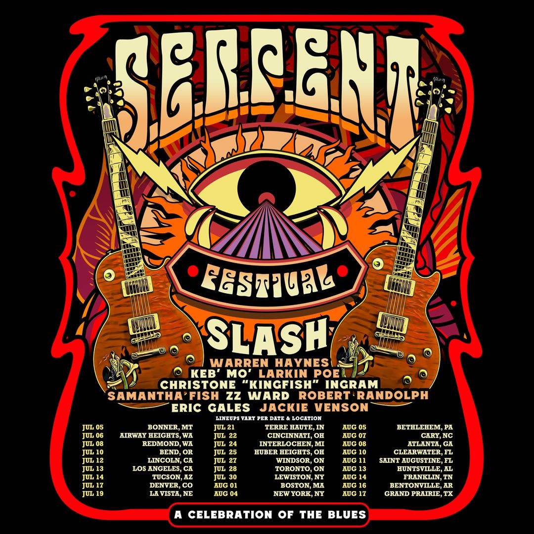 Para celebrar el próximo nuevo disco, SLASH seleccionó una formación de estrellas de Blues para unirse a él en el recientemente anunciado S.E.R.P.E.N.T. festival que recorrerá Norteamérica este verano, incluidos Warren Haynes Band, Keb’ ‘Mo, Christone “Kingfish” Ingram, Robert Randolph, Samantha Fish, Eric Gales, ZZ Ward, Jackie Venson y Larkin Poe. S.E.R.P.E.N.T. festival en el que actuará SLASH que aboga Solidaridad, Compromiso, Paz, Igualdad y Tolerancia, reunirá a los fans para celebrar el espíritu del Blues y generar conciencia y fondos para múltiples organizaciones benéficas que alientan a las comunidades marginadas, apoyan iniciativas de salud mental y comparten con SLASH. El enfoque de curar y de mejorar vidas para el beneficio de todos. Una parte de las ganancias de cada paquete VIP y S.E.R.P.E.N.T. Las entradas vendidas para el festival se destnarán directamente a las siguientes organizaciones benéficas que SLASH ha seleccionado: