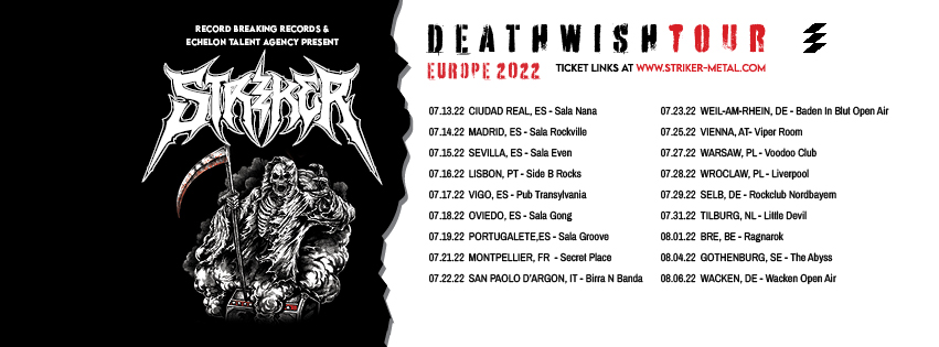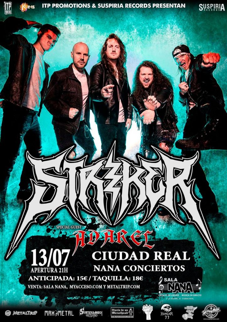 El miércoles 13 de julio los canadienses STRIKER arrancan en la Sala Nana Conciertos, de Ciudad Real su gira europea que contara con seis fechas a lo largo del mes de julio en nuestro país, la banda actuará en Ciudad Real, Madrid, Sevilla, Vigo, Oviedo, y Portugalete.