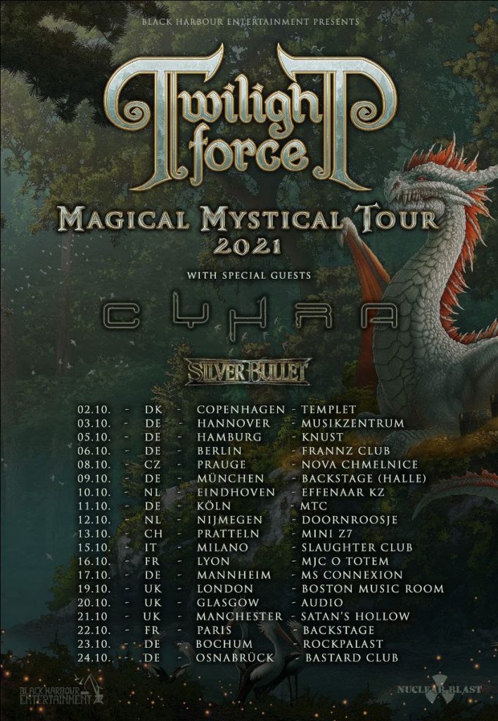 La banda afirma: ¡alegrarse! ¡Hay un faro de luz en estos tiempos difíciles! Estamos encantados de poder proclamar finalmente que el Magical Mystical Tour 2021 estará acompañado por nuestros estimados hermanos, CYHRA, así como por los resplandecientes caballeros de SILVER BULLET. Juntos traeremos esplendor, magia y gloria a las tierras. Volvamos a estar unidos en el campo de batalla y celebremos un retorno a la vida y a la prosperidad tal como era una vez. ¡Que el poder del dragón te guíe y te proteja!.