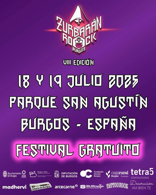 La VIII edición del Zurbarán Rock Burgos se celebrara el 18 y 19 de julio en el Parque de San Agustín y será gratuito como de costumbre.